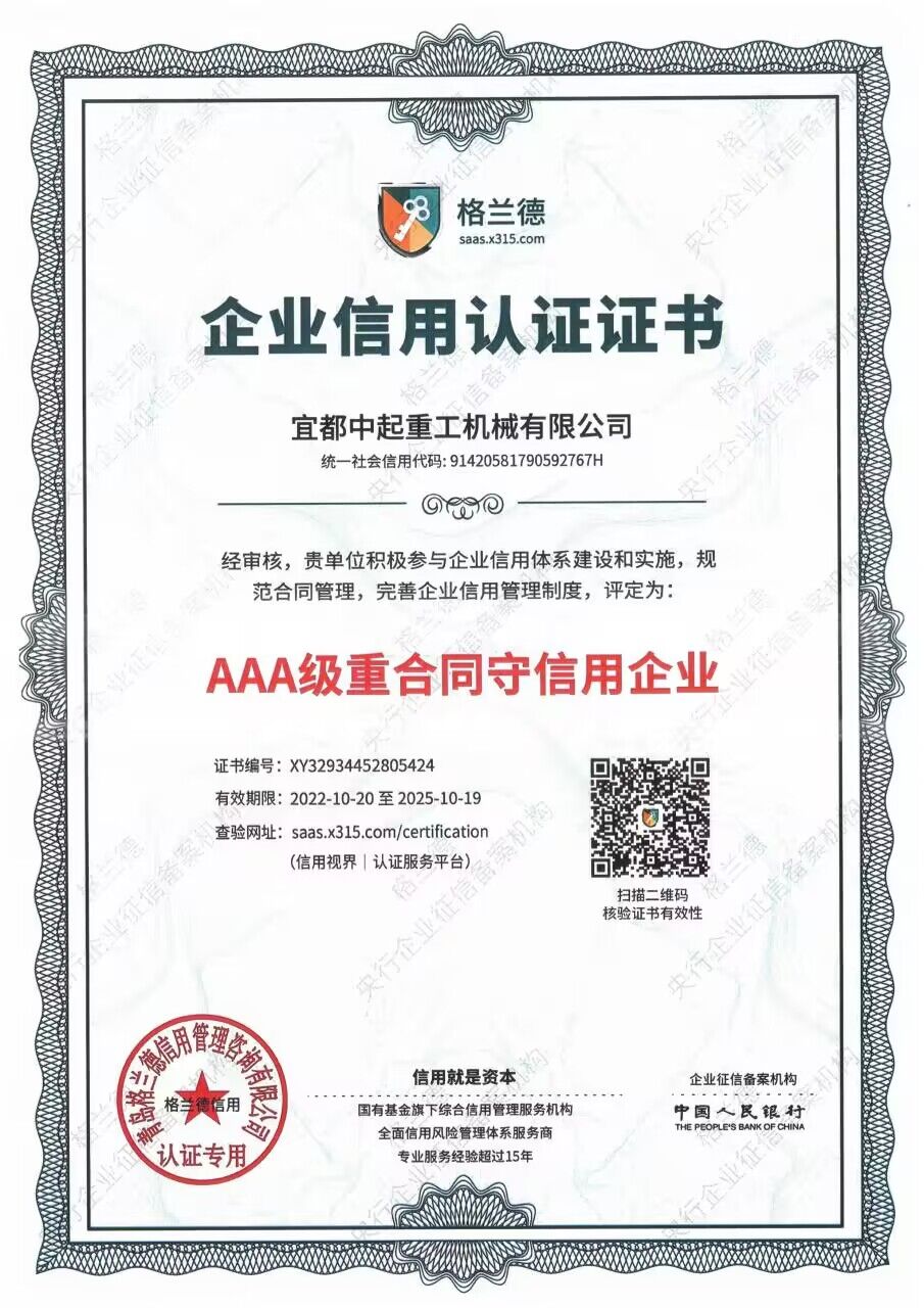 2022年宜都中起重工機械有限公司被信用視界評為AAA級重合同守信用企業(yè)。