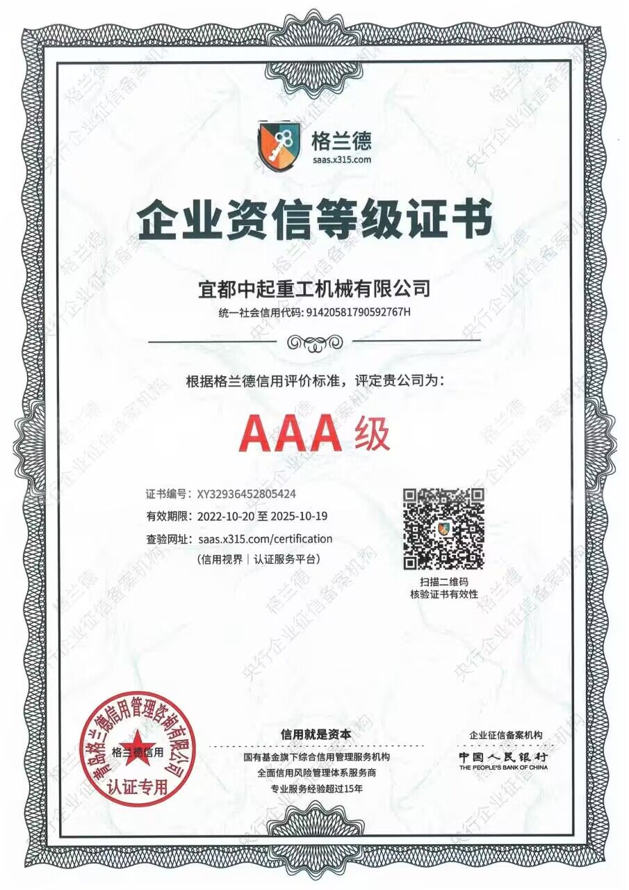 2022年宜都中起重工機(jī)械有限公司被格蘭德信用評(píng)價(jià)為AAA級(jí)企業(yè)。